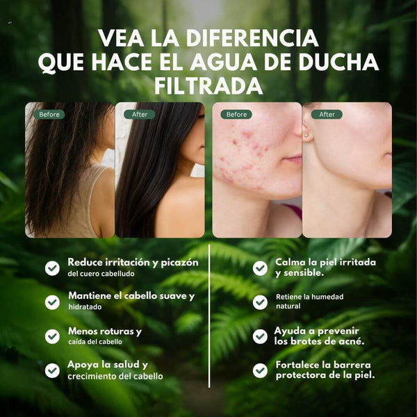 Elimina químicos dañinos del agua, reduciendo irritaciones y fortaleciendo el cabello.